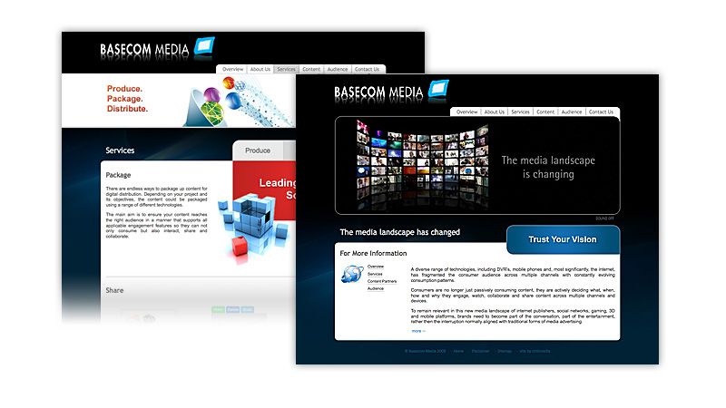 - This project involved a new build for the Basecom website, promoting a start-up media company. My role was to facilitate all client-side development from the development design phase. Functionality included custom banner behaviour (flash-based), flash video preparation/ insertion, form functionality (validation and usability) at the client/ server sides and Google map insertion.